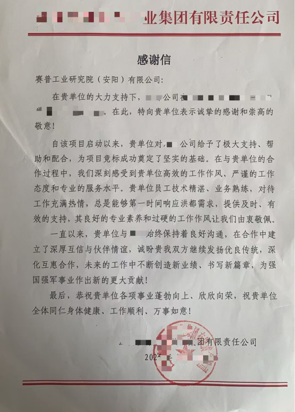 近期,賽普工業(yè)研究院(安陽)有限公司(以下簡稱“賽普公司”)再次收到來自客戶的感謝信,客戶對公司在某特種裝備生產(chǎn)任務(wù)中提供的卓越支持予以高度評價。今年以來,賽普公司已多次獲得客戶的書面感謝和電話感謝。贊譽的背后,是市場與客戶對賽普公司技術(shù)實力、服務(wù)品質(zhì)與履約精神的高度認可與信賴。